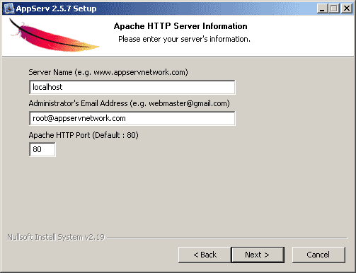 - Pada window Apache Configuration, isi dengan localhost port 80 kemudian klik Next.