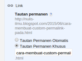 Tadi sudah saya jelaskan bahwa permalink untuk halaman entri akan digenerate secara otomatis dari judul artikel dan diawali oleh tahun dan bulan saat dipublikasi. Jadi secara default seharusnya kita tidak perlu membuat Custom Permalink. Misalnya untuk artikel tentang “Apa itu Permalink?” saya tidak menggunakan Custom Permalink dan murni menggunakan Permalink yang digenerate secara otomatis yaitu //nulis-ilmu.blogspot.com/2015/06/apa-itu-permalink.html.